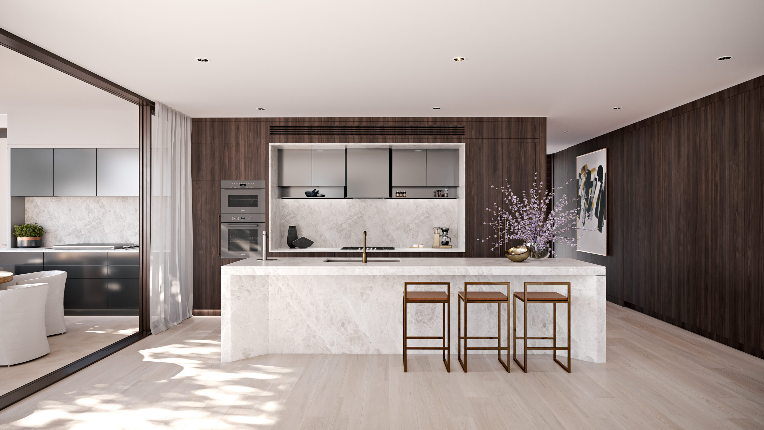 • The kitchen is well-appointed with high-end Miele appliances, gas cooking facilities, a double sink, and ample cabinet space for all your culinary needs.
