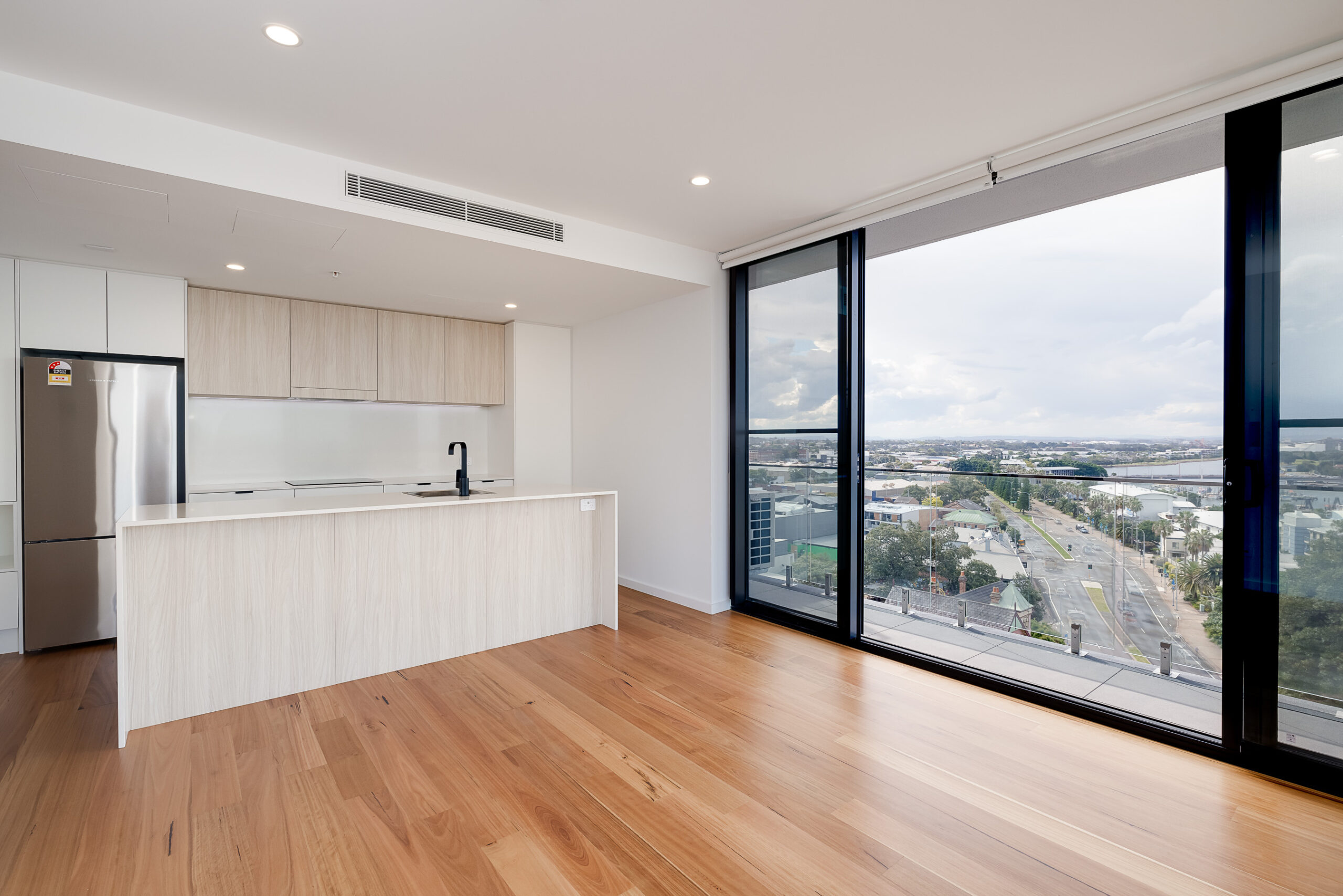 The open plan kitchen with quality appliances (including fridge) overlooks the living area, which opens up with a stacking sliding door to the balcony.