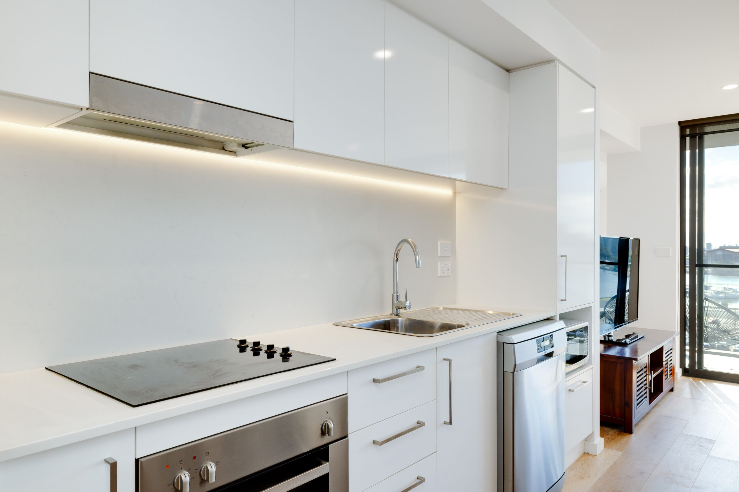The open plan kitchen offers Caesar stone benchtops and splashback and ample cupboard space, with electric cooking and a dishwasher.