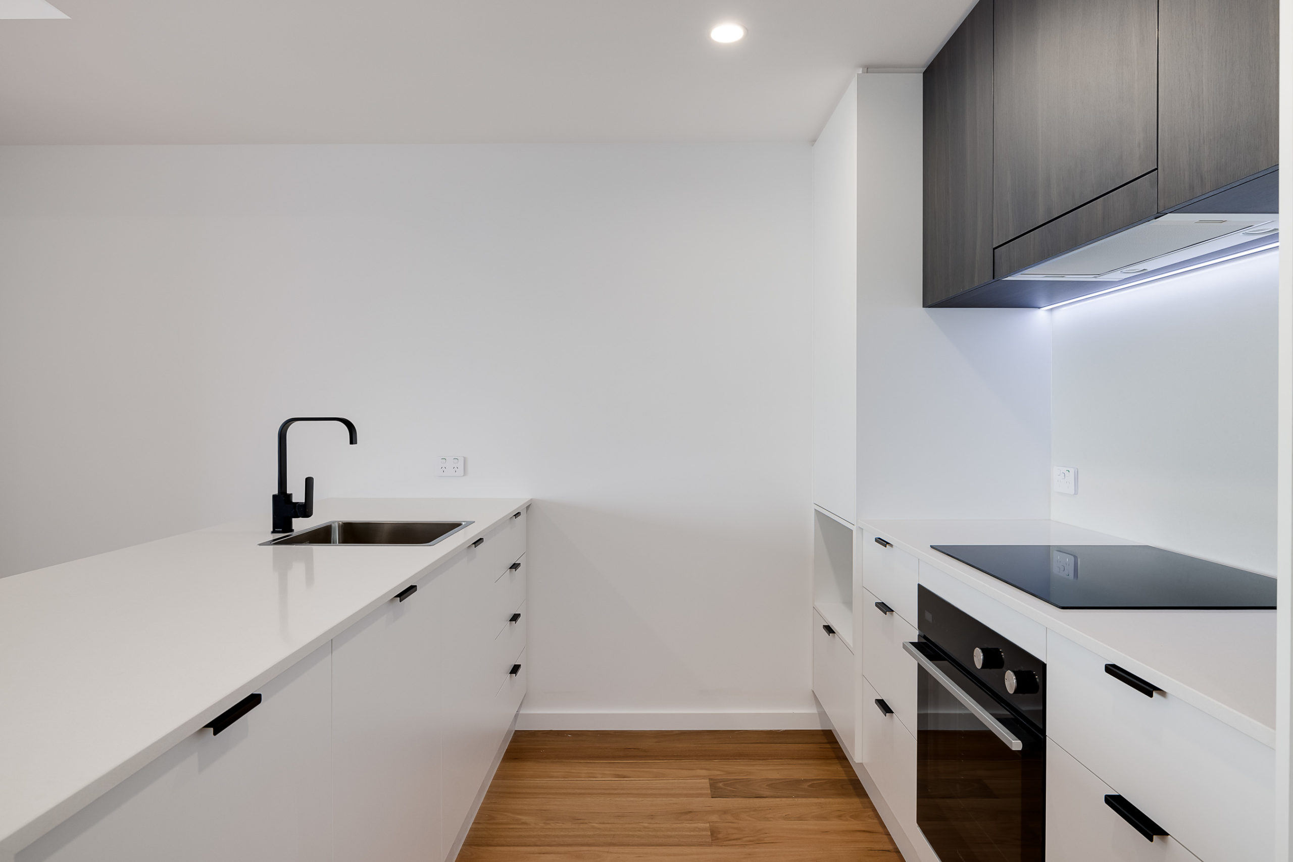 The open plan kitchen/meals area includes quality appliances (including fridge), and overlooks the sizeable living area, which opens up with a stacking sliding door to the balcony.