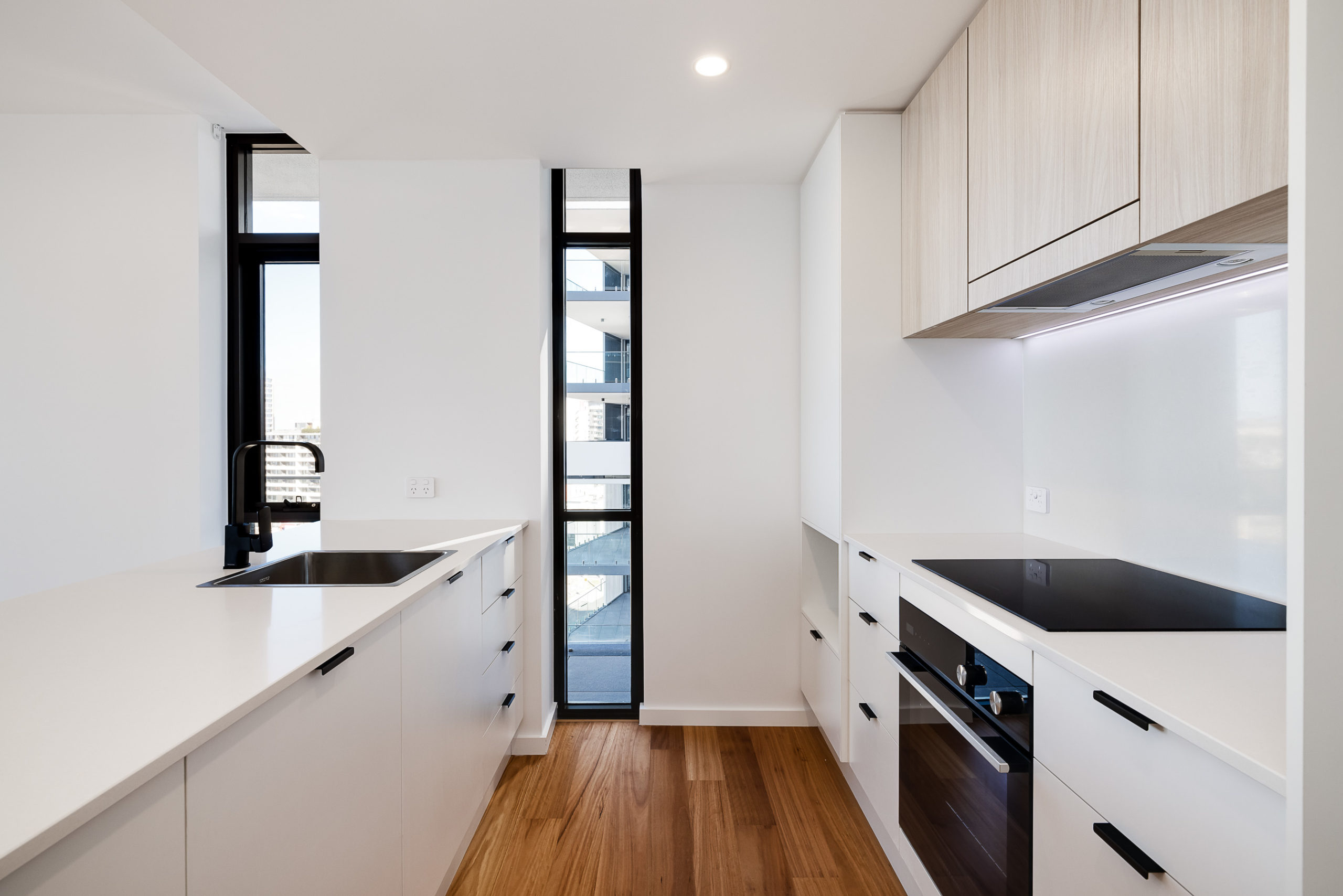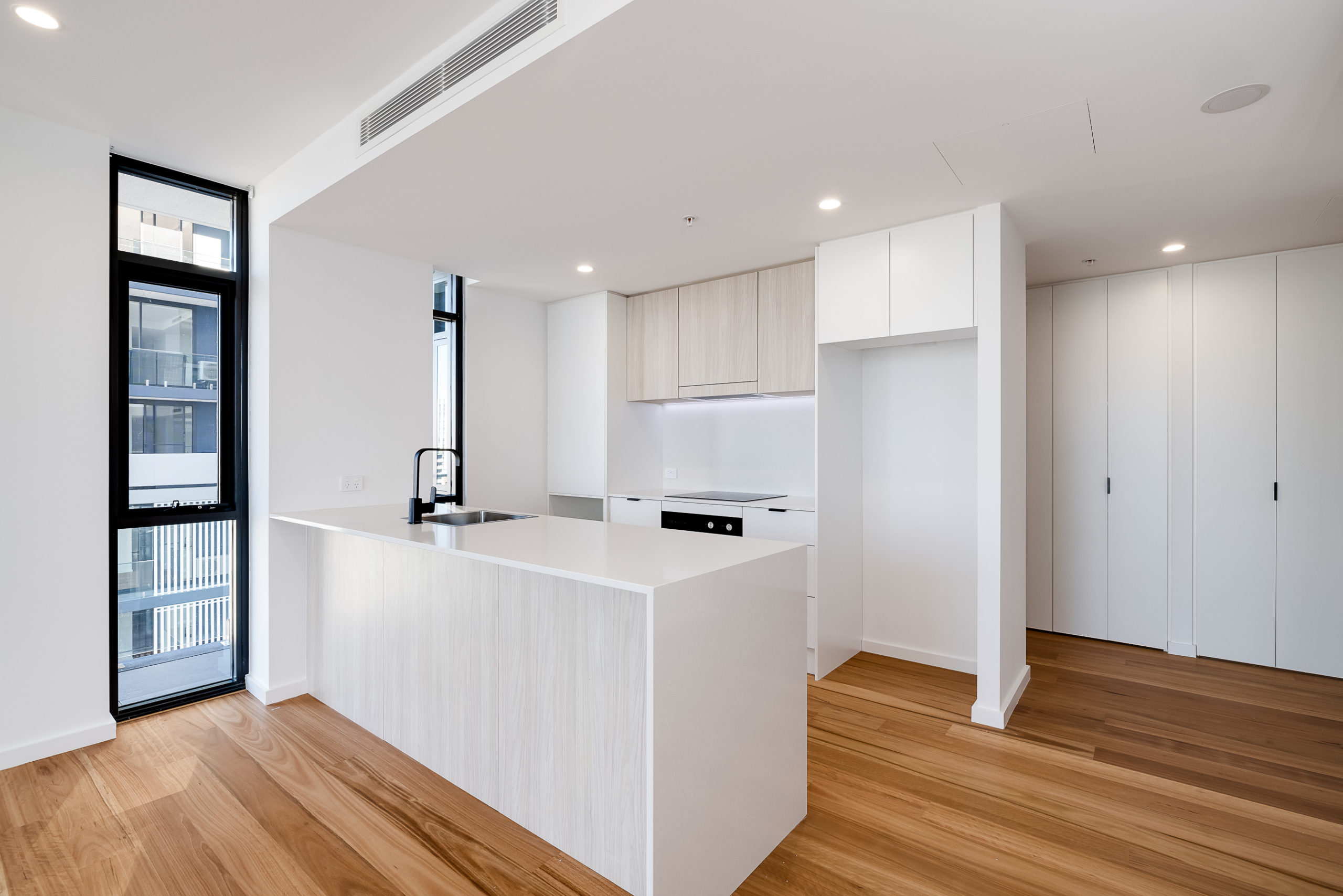The open plan kitchen with quality appliances (including fridge) overlooks the living area, which opens up with a stacking sliding door to the balcony.