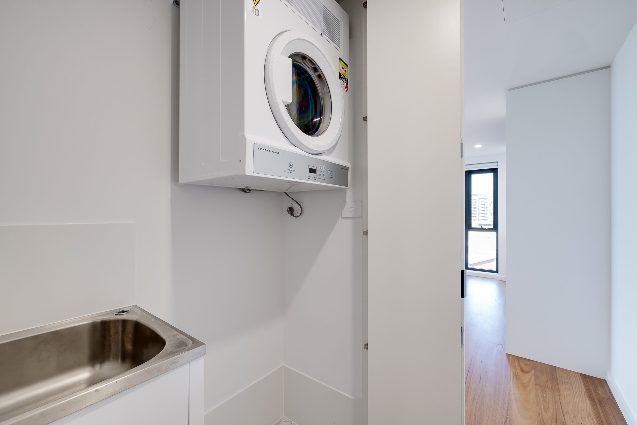 Tucked away is your European style laundry with wall hung dryer and additional storage space.