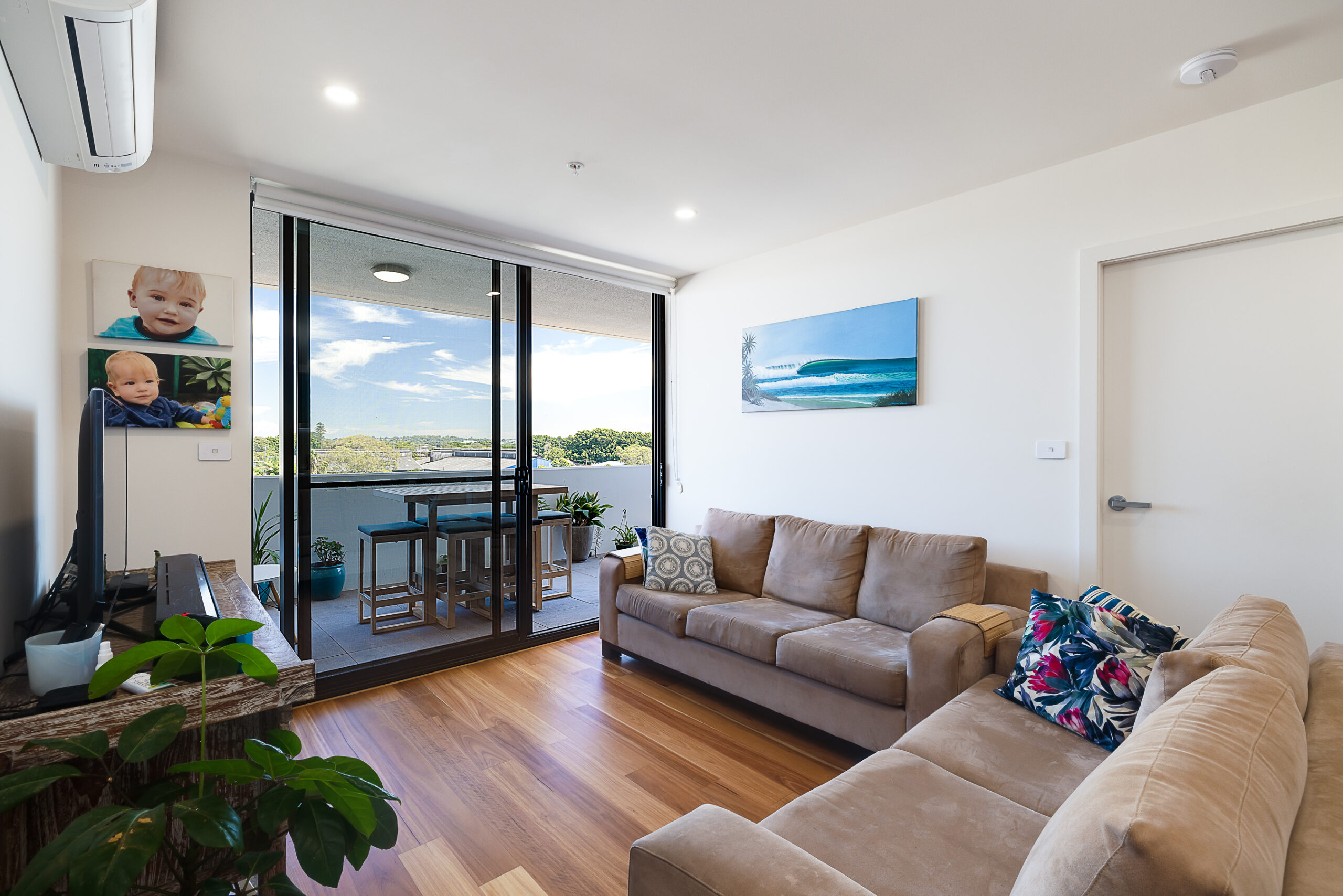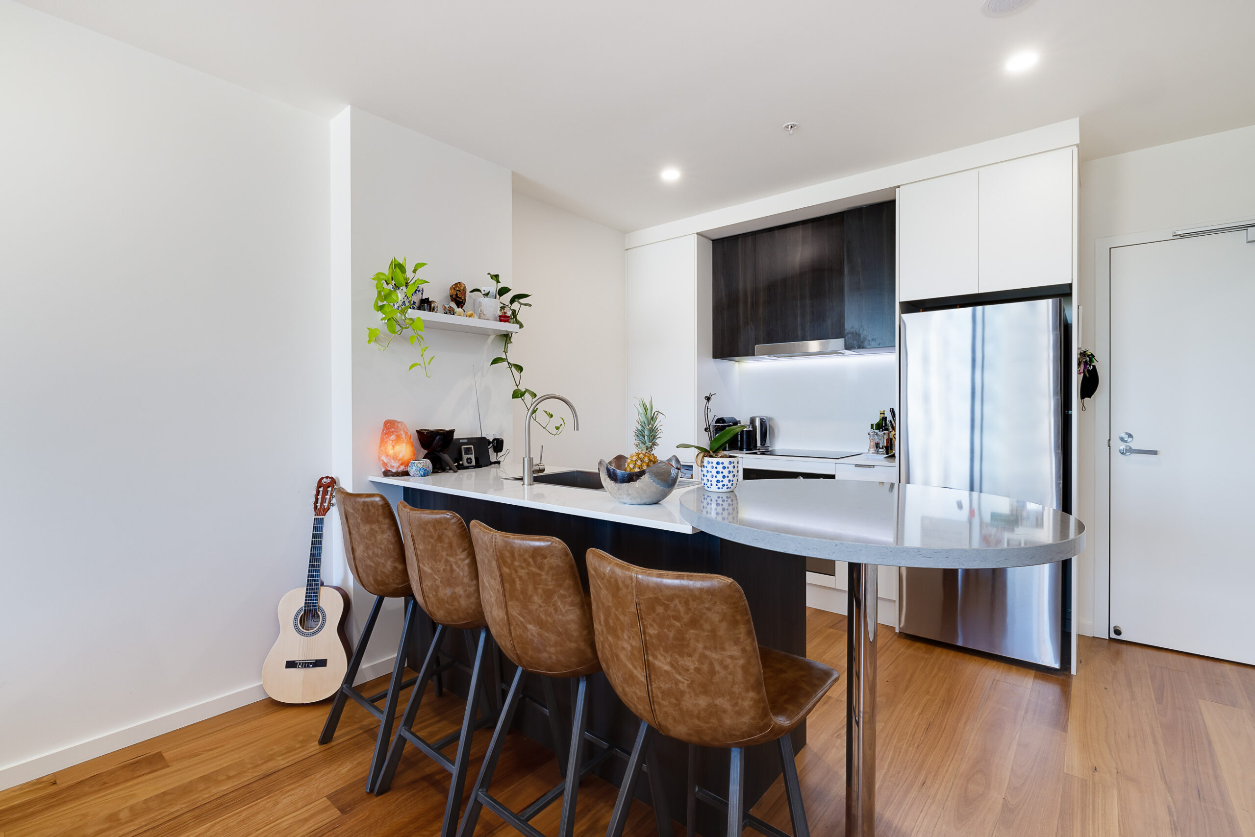 The open plan eat in kitchen/meals area incorporates the air conditioned living area, which opens up to the large balcony.